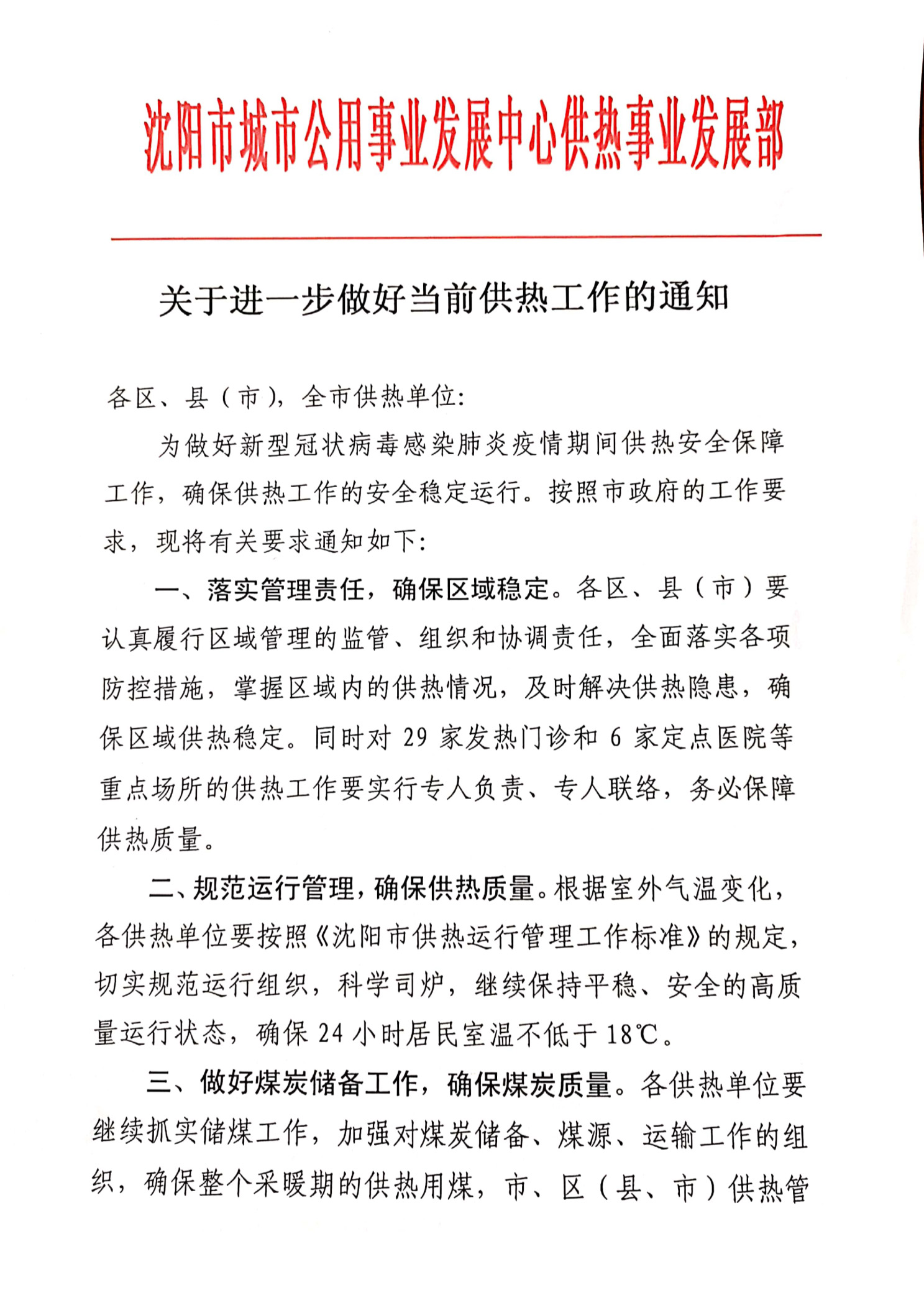一、落实管理责任,确保区域稳定。 各区 、县(市) 要 认真履行区域管理的监管、组织和协调责任, 全面落实各项防控措施,掌握区域内的供热情况,及时解决供热隐患,确保区域供热稳定。同时对29家发热门诊和6家定点医院等重点场所的供热工作要实行专人负责、专人联络,务必保障供热质量。