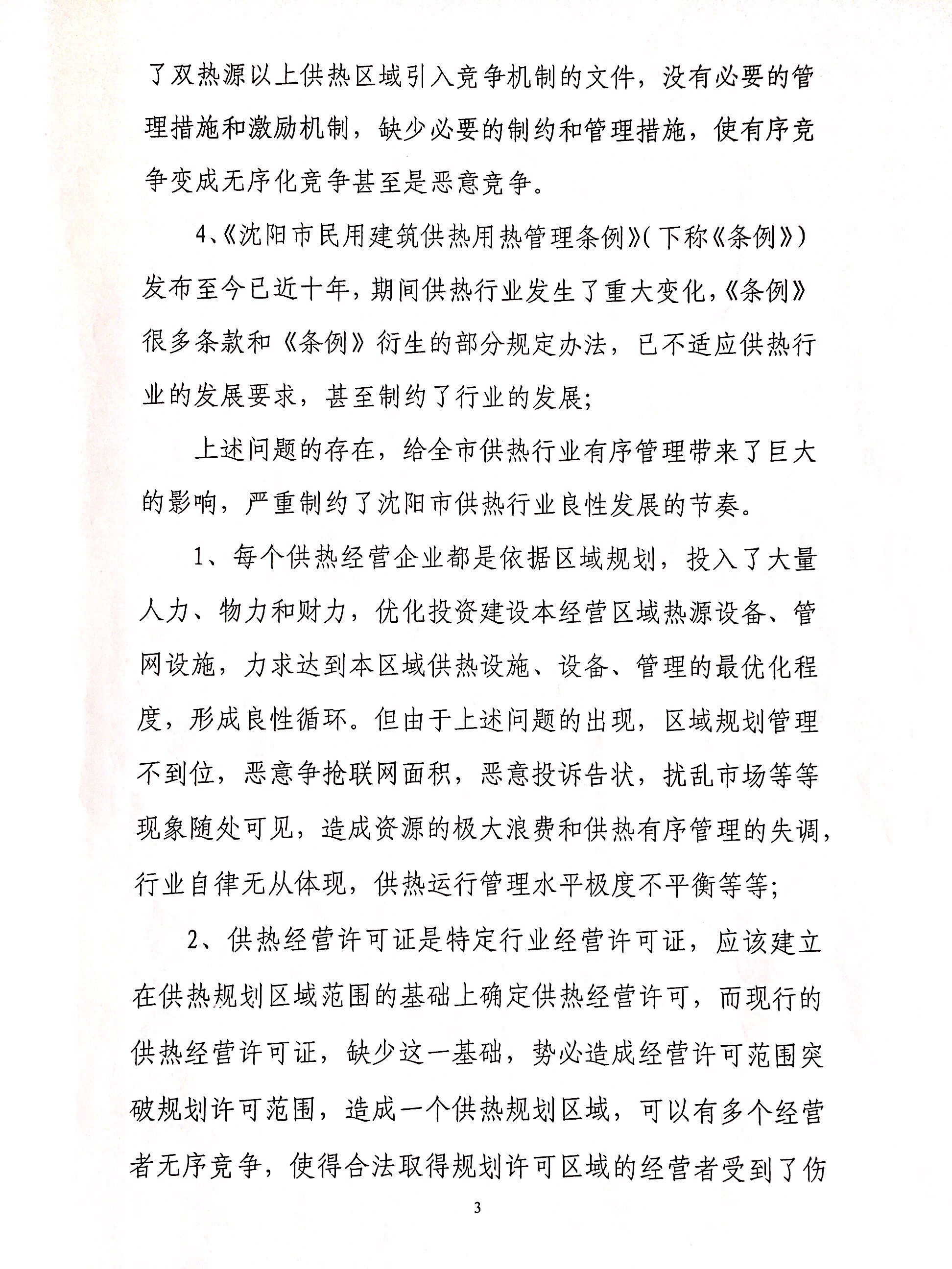 4、《沈阳市民用建筑供热用热管理条例》(下称《条例》)发布至今已近十年,期间供热行业发生了重大变化,《条例》很多条款和《条例》衍生的部分规定办法,已不适应供热行业的发展要求,甚至制约了行业的发展;