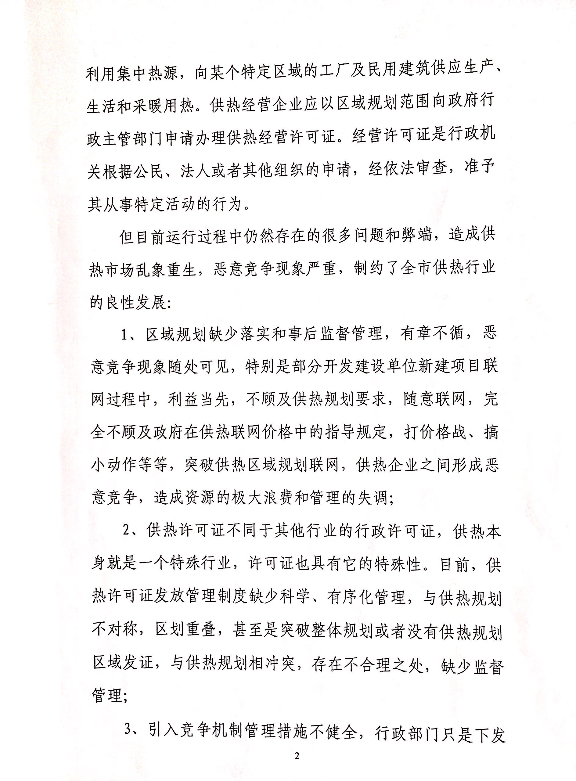 1、每个供热经营企业都是依据区域规划,投入了大量人力、物力和财力,优化投资建设本经营区域热源设备、管网设施,力求达到本区域供热设施、设备、管理的最优化程度,形成良性循环。但由于上述问题的出现,区域规划管理不到位,恶意争抢联网面积,恶意投诉告状,扰乱市场等等现象随处可见,造成资源的极大浪费和供热有序管理的失调,行业自律无从体现,供热运行管理水平极度不平衡等等;