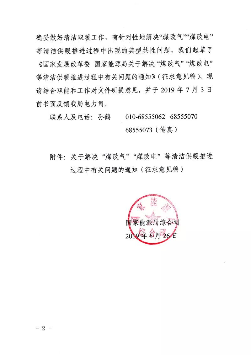通知丨国家能源局综合司征求《关于解决“煤改气”“煤改电”等清洁供暖推进过程中有关问题的通知》意见的函